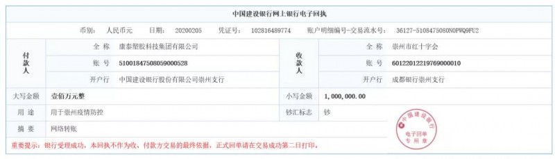 2008年5月12日,汶川特大地震災(zāi)害發(fā)生后,康泰積極捐款捐物,先后向汶川第一中學(xué)、都江堰一中、雁門小學(xué)、雁門安置房、映秀大壩水站、綿竹市板房區(qū)以及什邡市新農(nóng)村建設(shè)等地震災(zāi)區(qū)捐款、捐物達(dá)300余萬元。2020年1月,一場突如其來的新型冠狀病毒肺炎疫情肆虐中華大地。康泰率先響應(yīng)社會(huì)號召,第一時(shí)間向崇州市紅十字會(huì)捐款100萬元,專門用于疫情防控工作,彰顯了大愛無疆的新時(shí)代企業(yè)精神。