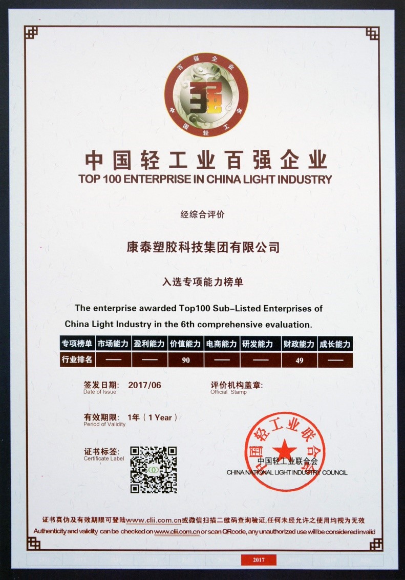 6月20日上午,由中國輕工業(yè)聯(lián)合會主辦、中國輕工業(yè)信息中心承辦的第六屆中國輕工業(yè)百強(qiáng)企業(yè)頒獎盛典暨“智慧輕工”高峰論壇在中國職工之家隆重召開。大會向社會各界隆重發(fā)布了“2016年度中國輕工業(yè)百強(qiáng)企業(yè)”榮譽(yù)榜單??堤┘瘓F(tuán)有限公司憑借良好的價值能力和財政能力再度入圍 “2016年度中國輕工業(yè)百強(qiáng)企業(yè)”及“中國塑料管材行業(yè)十強(qiáng)企業(yè)”榜單。康泰集團(tuán)北京分公司經(jīng)理蔣華成代表公司參加會議并接牌。